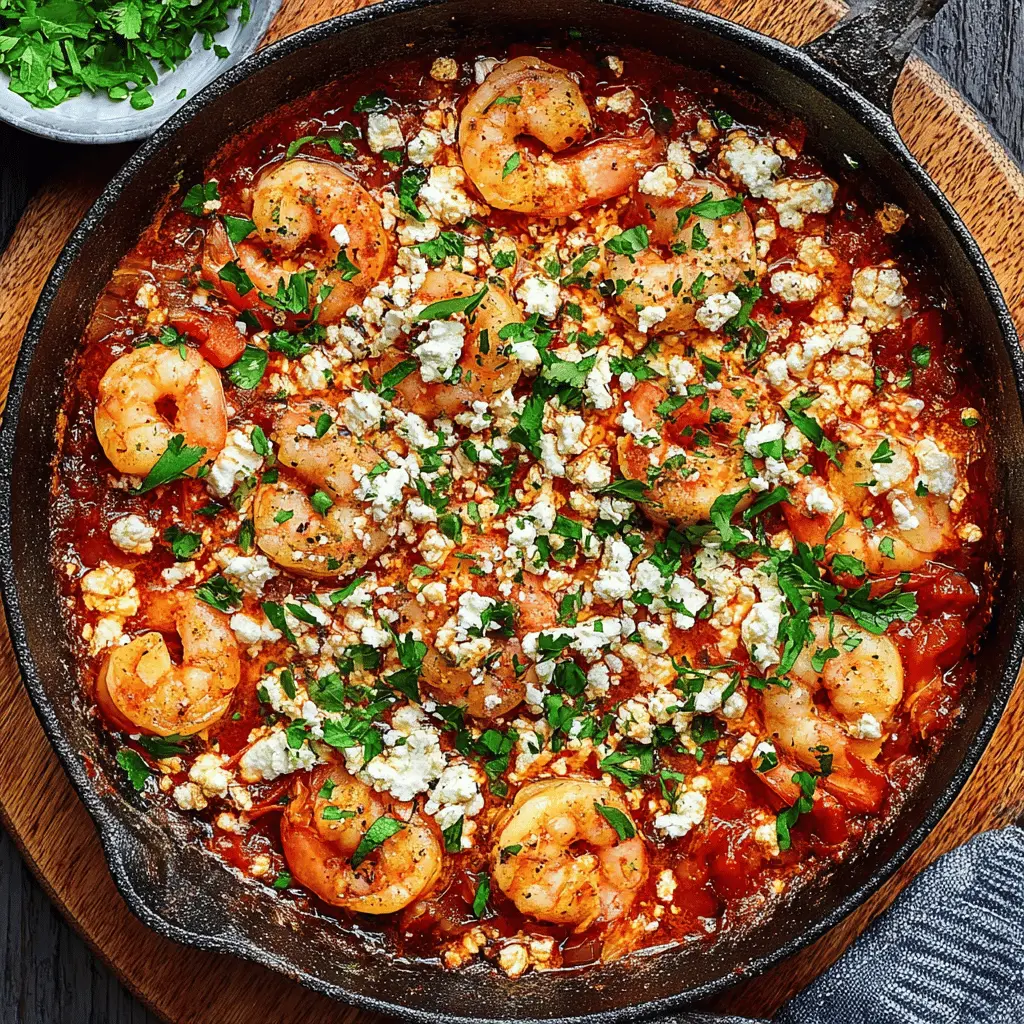 Sprinkle the crumbled feta cheese evenly over the shrimp and tomato mixture. Cover the skillet with a lid and cook for another 1-2 minutes. This will soften the feta and infuse the flavors without completely melting it.