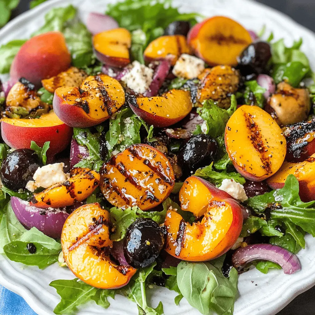 This refreshing salad features juicy grilled peaches paired with crisp greens. Toss in some nuts for crunch and a touch of cheese for extra flavor—yum!