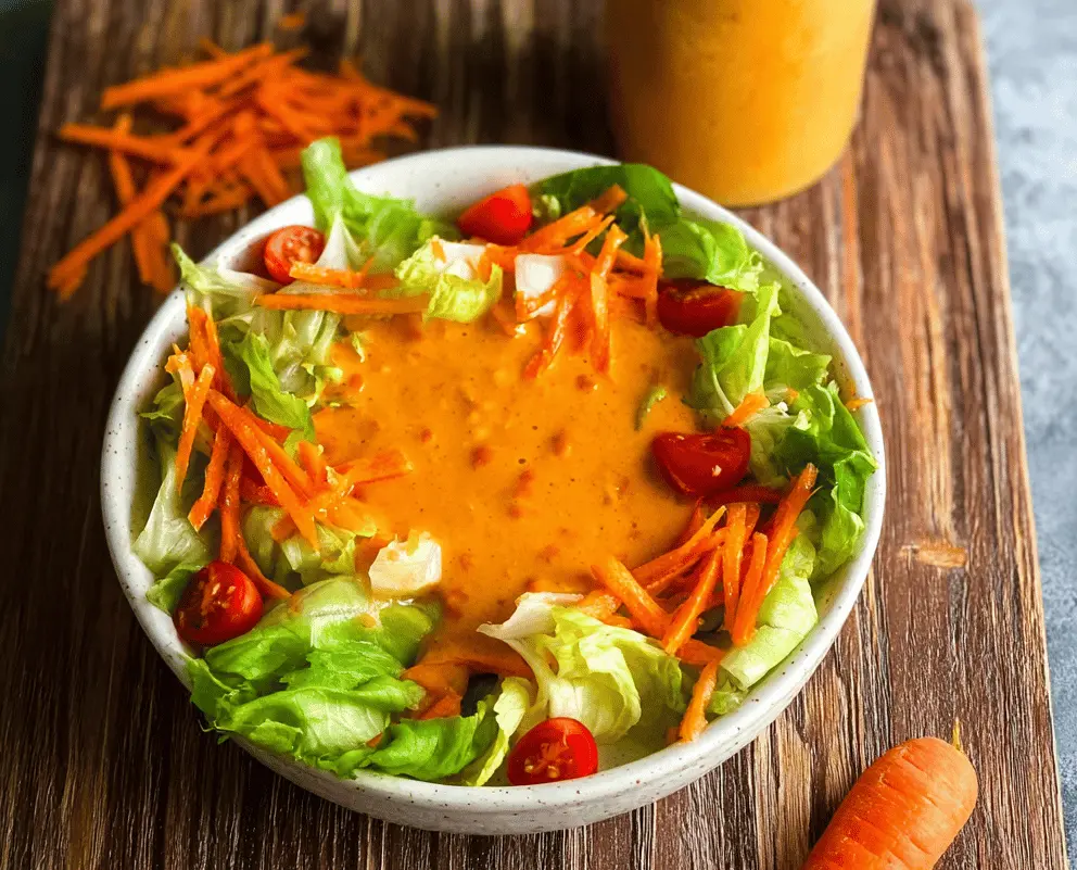 This light and zesty carrot ginger dressing is a perfect addition to salads! It blends fresh carrots, tangy ginger, and a splash of vinegar for a burst of flavor.