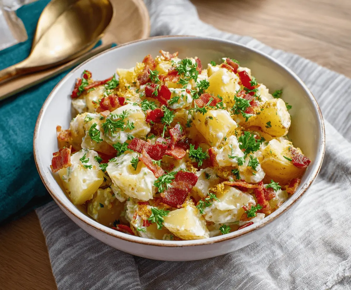 This hearty German potato salad is warm and tangy, a perfect side dish for any meal. Made with tender potatoes, crispy bacon, and a zesty vinegar dressing, it’s simply delicious!
