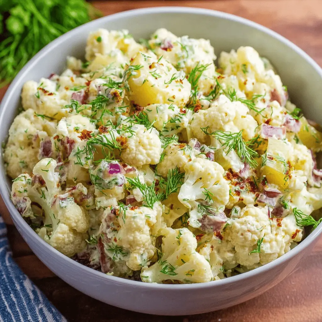 Before serving, sprinkle freshly chopped dill or parsley on top for a colorful and fresh touch. Serve chilled and enjoy your tasty low carb cauliflower “potato” salad with friends and family!