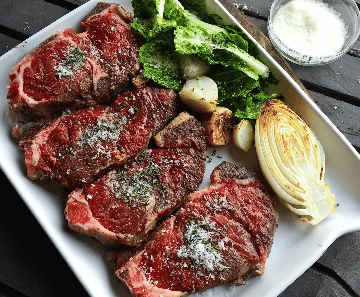 This slow-roasted ribeye steak is juicy and full of flavor! Paired with colorful veggies and a tasty grilled Caesar salad, it’s a perfect meal for any occasion.